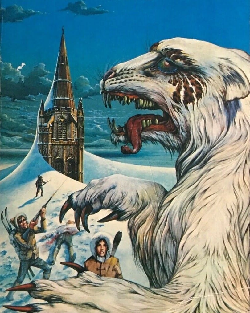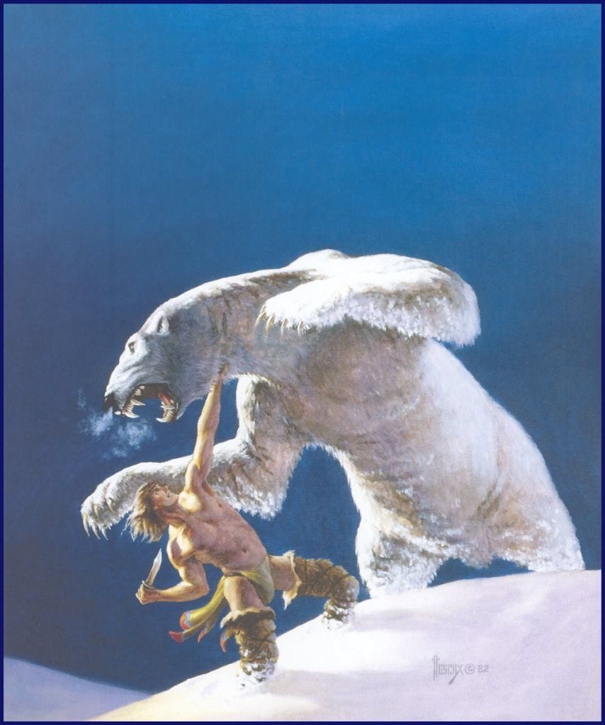 Wow, not many images, huh? Here, let's pad this out with a couple more polar bears from sci-fi and fantasy art, starting with a little hand-to-hand combat in this 1982 Richard Hescox illustration.