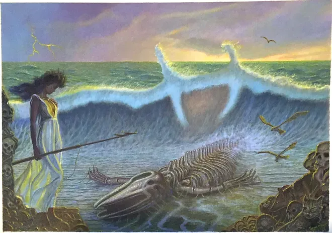 Terry has returned to painting in color - here delivering a clear response to global climate change, something which Terry feels strongly about. This is a painting full of symbolism - with the skeleton of a Minke whale, which in this work represents all whales, having been killed for the benefit of the 'first sea monster': humans, in the form of a beautiful girl, who holds a harpoon. Whales are not only being killed for beauty products, but also pet food (thus, the images of a dog and a cat set among the skulls of all the humans whose lives have, over the centuries, been taken by drowning on sunken whaler ships, or simply lost at sea) All this is backgrounded by a violent ocean, which, in the painting, almost becomes an evil, sentient being, ie: the threatening horns of surf. It's a major message, packed into a beautiful painting. -Jane Frank