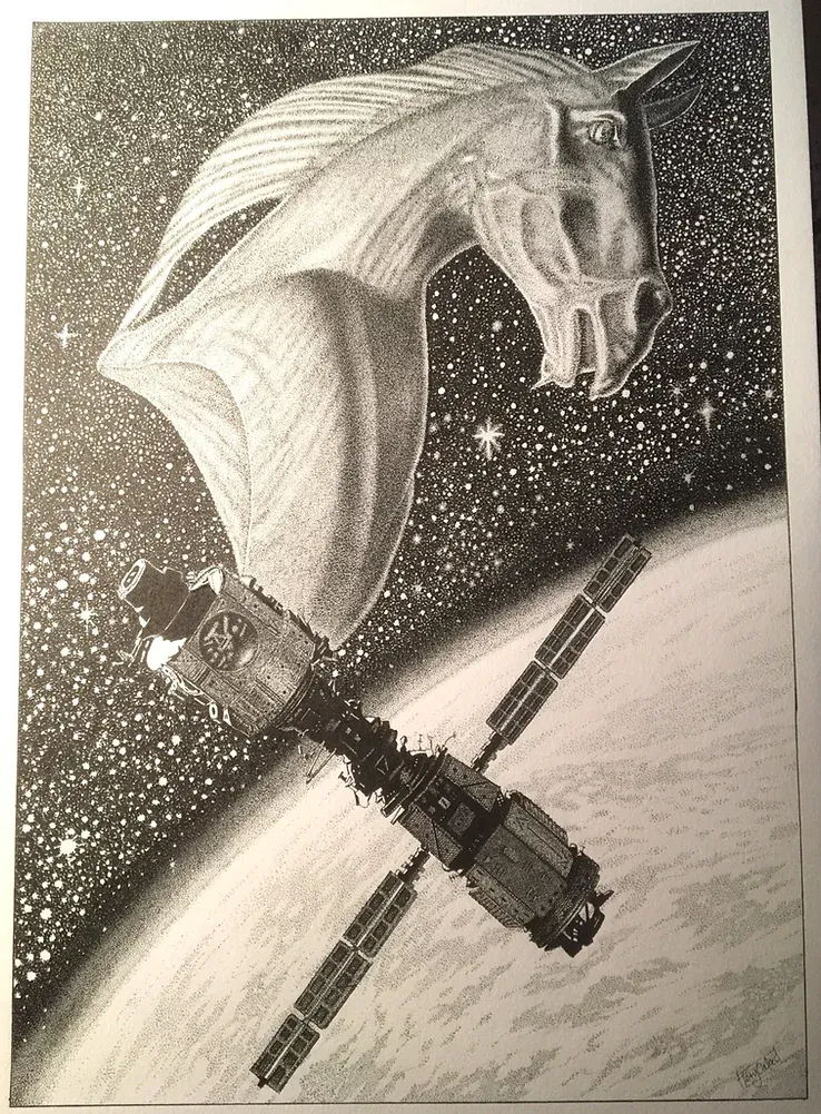 The juxtoposition of images here creates a powerful visual effect, with the giant horse's head representing the discovery and subsequent awareness that an alien civilzation might exist somewhere "out there" - more advanced than our own in ways beyond technology.