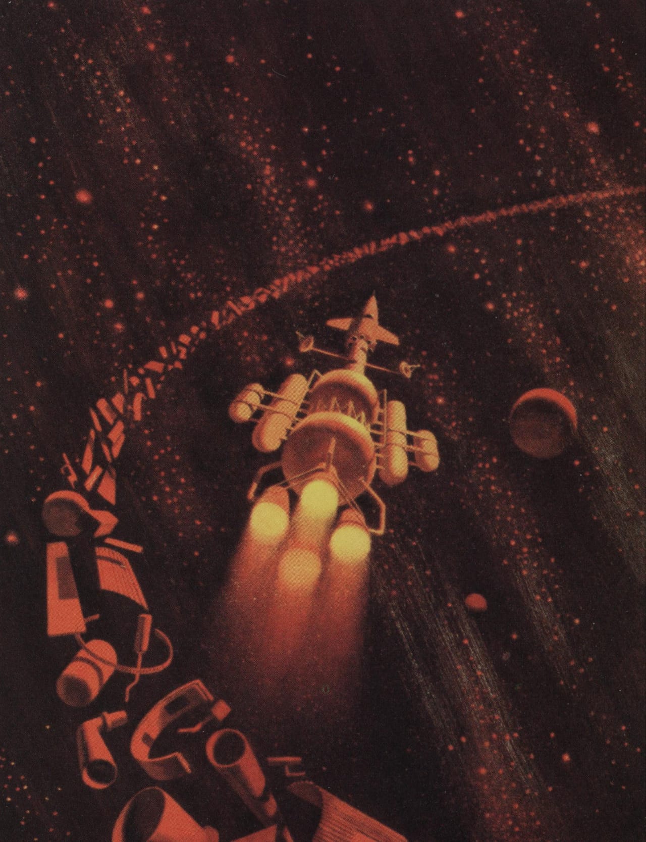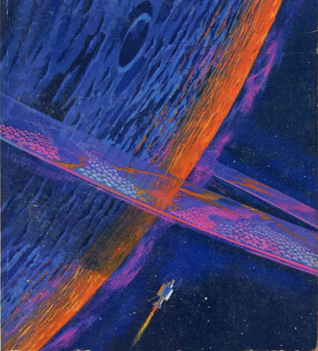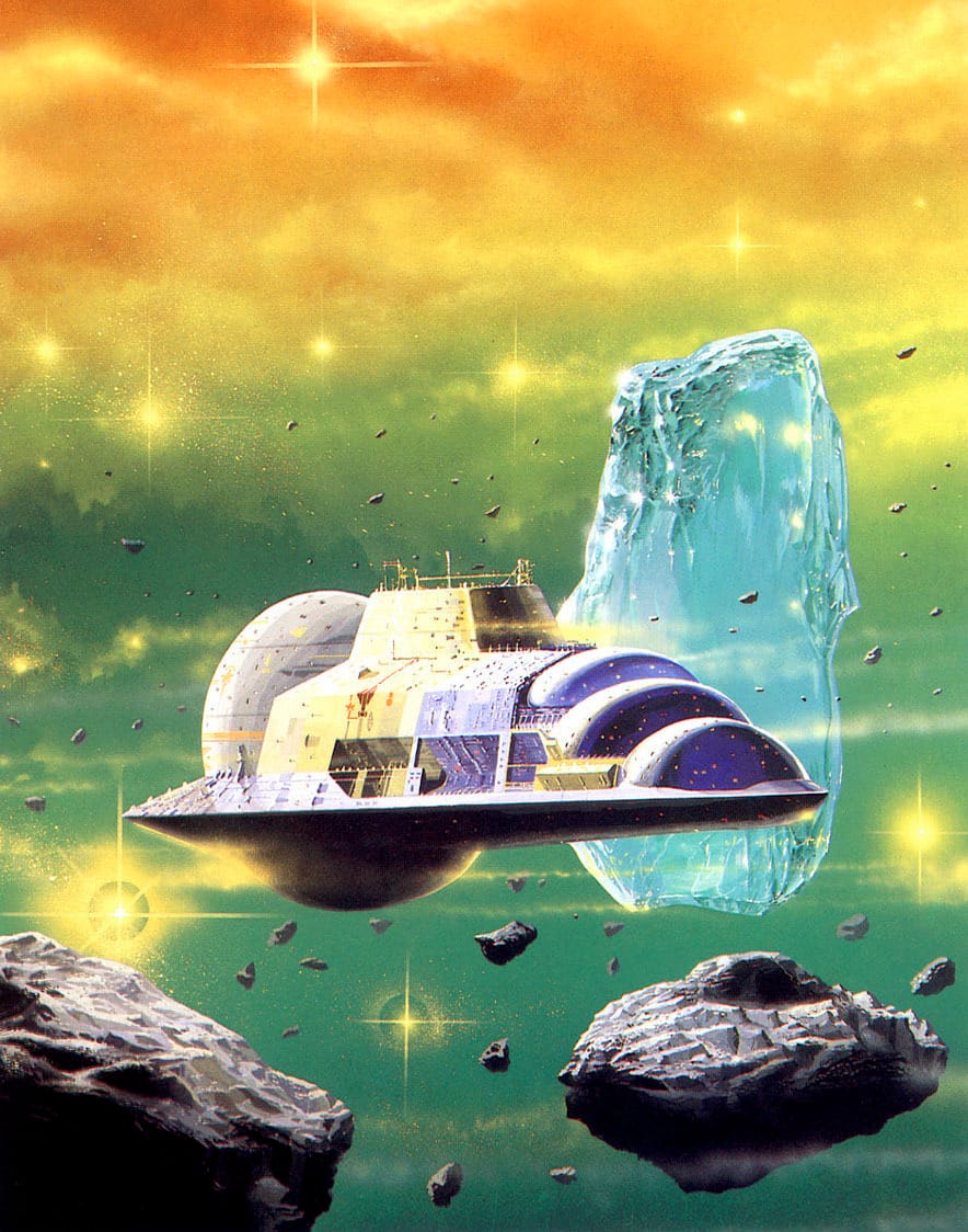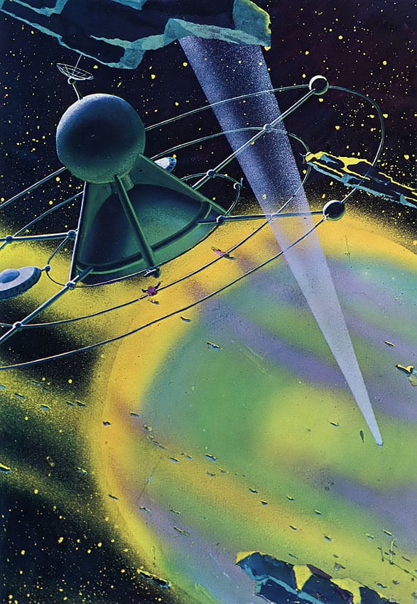 This “astrolab” by Angus McKie operates from within the rings of Saturn, according to Spacecraft 2000 to 2100 AD, the Terran Trade Authority book where it appeared in 1978.
