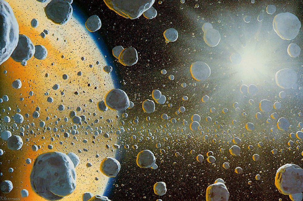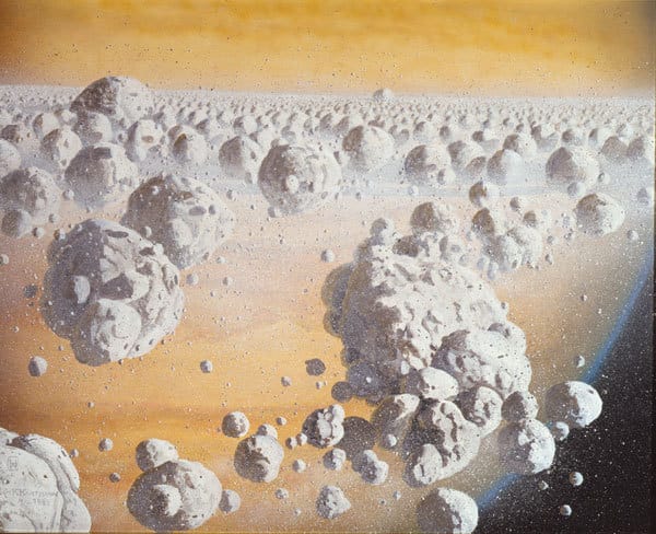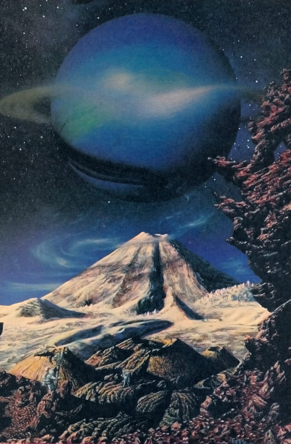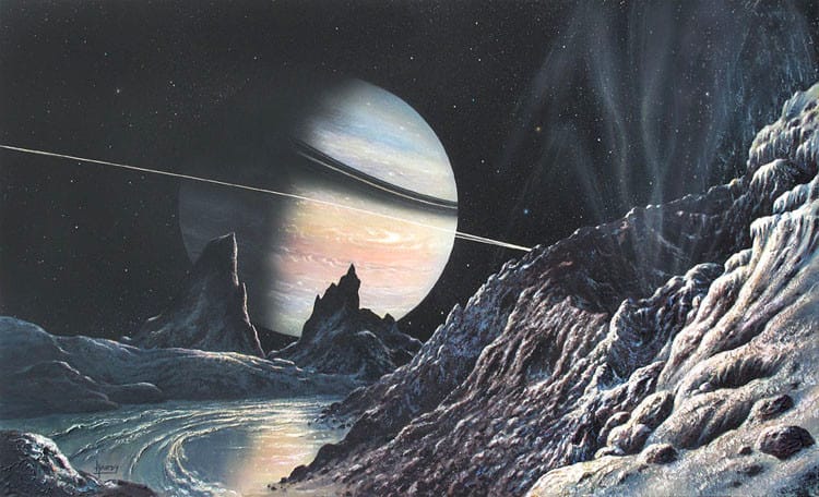 So did Dr. William K Hartmann for this 2006 illustration, “Eruption on Saturn’s moon, Enceladus, based on discoveries by Cassini spacecraft.”