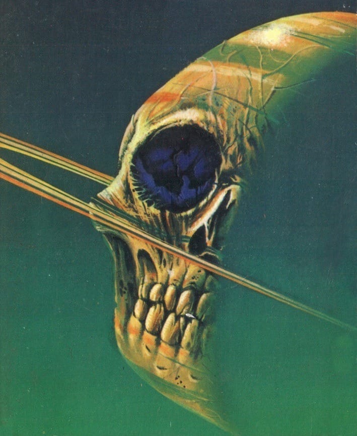Even more stylized is Ray Feibush's skullified 1974 version, done as a cover for Isaac Asimov's The Rings of Saturn.