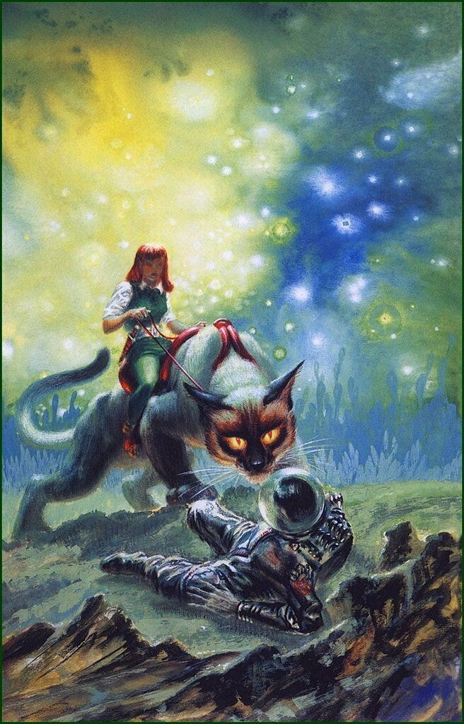 Fun fact: For this cover, Freas actually used a reference image of his own daughter riding the family cat, a 28-pound Siamese.