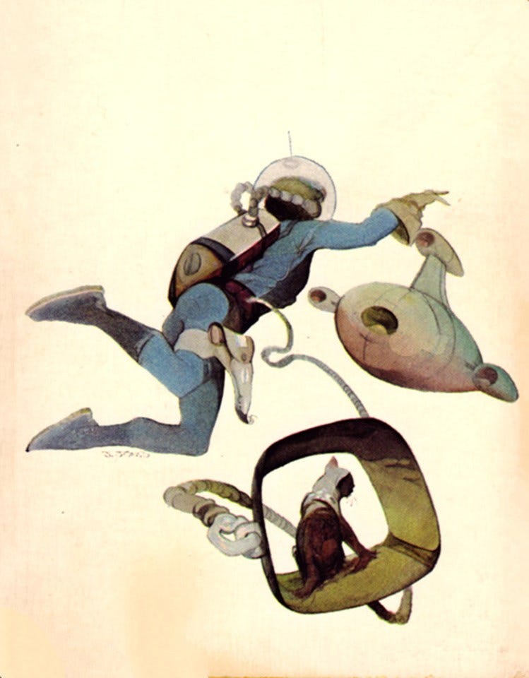 I don’t have hard evidence for this theory (aside from the Freas household), but I suspect the answer is simple: Sci-fi artists love cats just as much as everyone else, and don’t need much of an excuse to showcase a few of them floating through space in their kitty carriers.