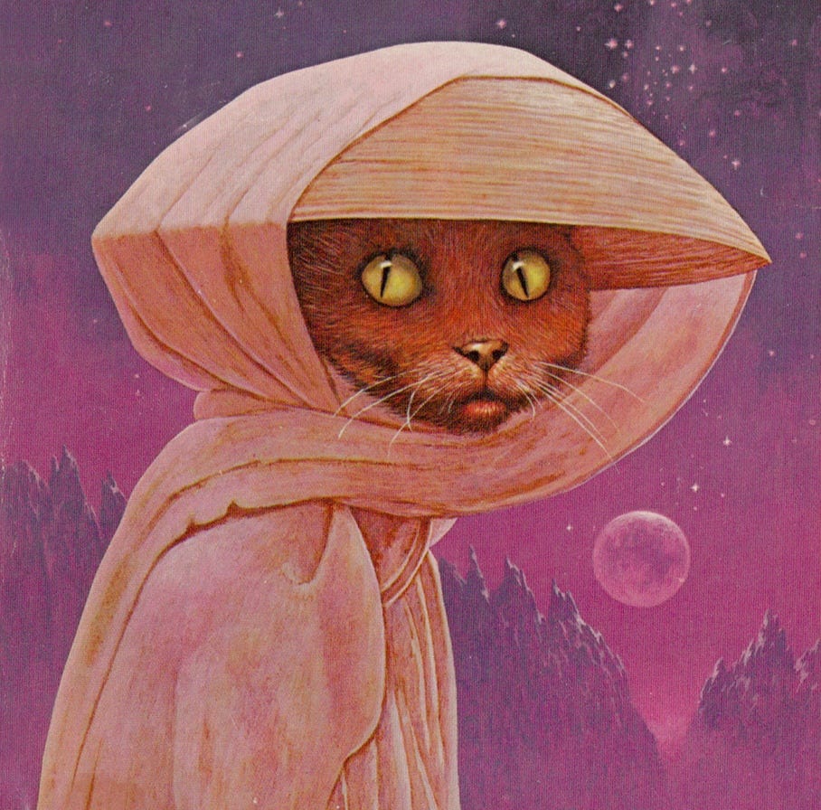 Technically, Eet is far from a cat, but don’t tell the cover artists. Here’s Jeffrey Catherine Jones’ dynamic-yet-minimalist 1969 cover, a top-tier entry in Space Cat canon.