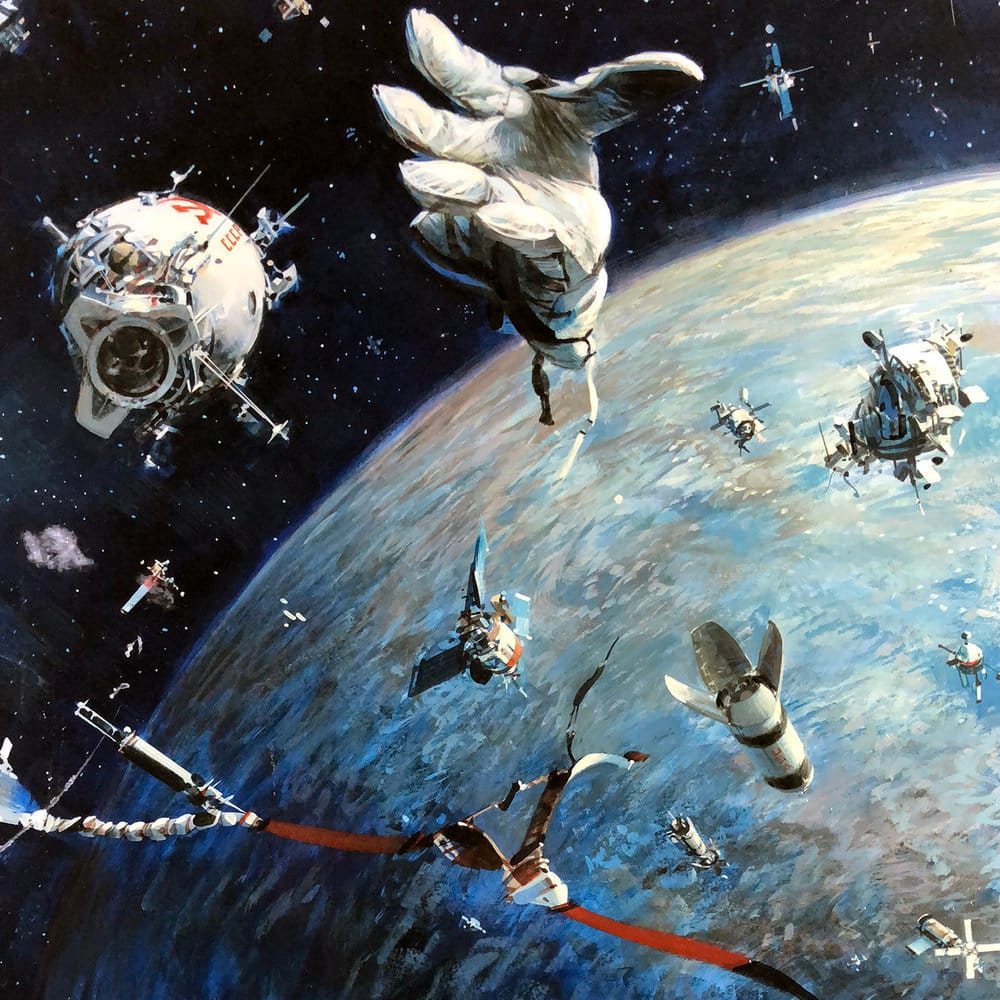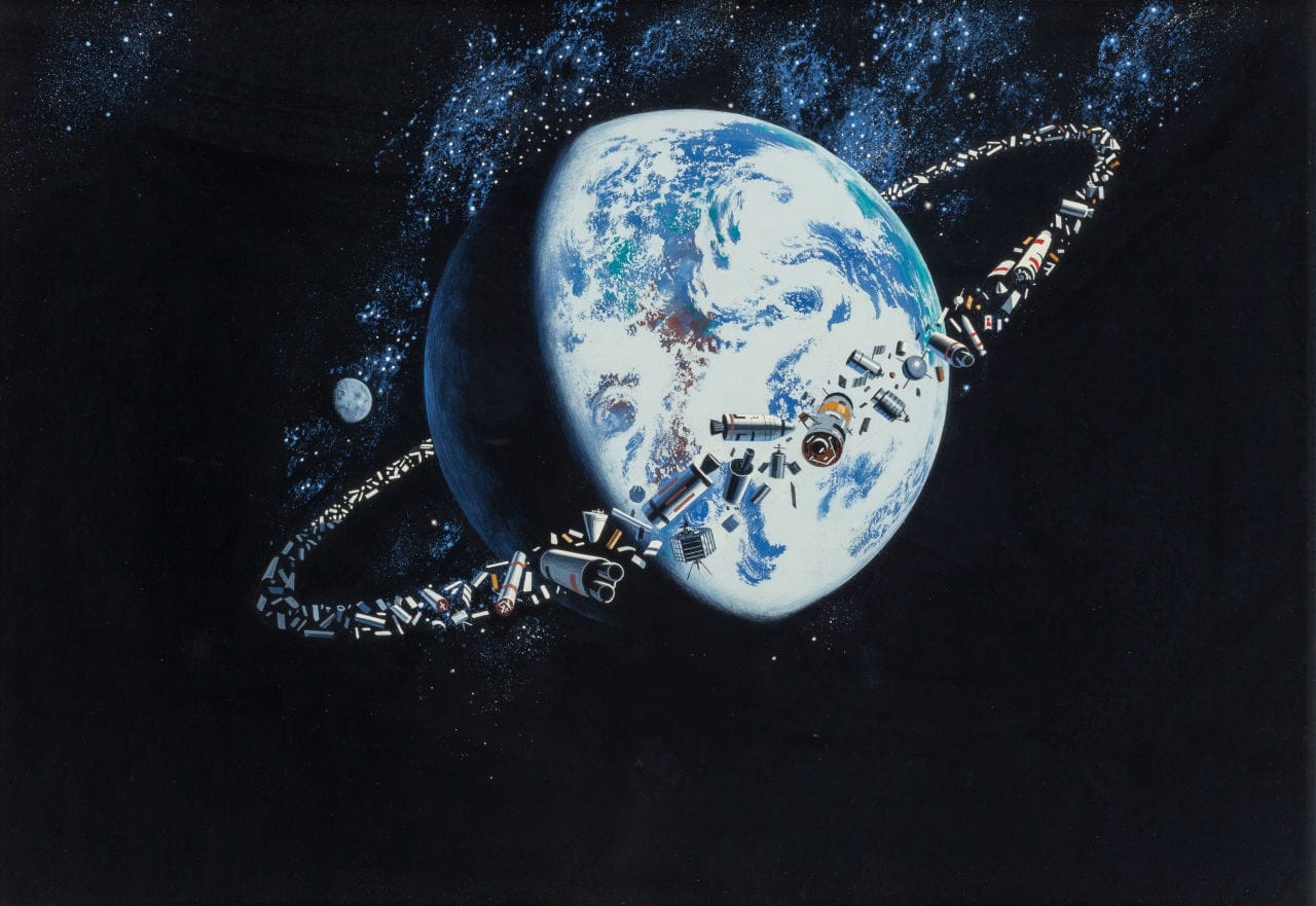 Decades later, a new crop of artists raised on those images brought new interpretations and inventions. They shaded in the imagined futures, illustrating the knock-on effects of all this space exploration. One big one: It creates a lot of junk.