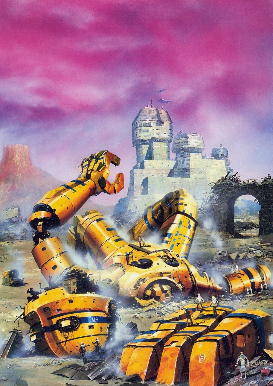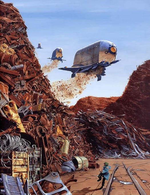 Given that he's a big fan of the down-and-dirty industrialized side of science fiction, it's no surprise that Chris Foss has a few futuristic junkyards under his belt, like this one: