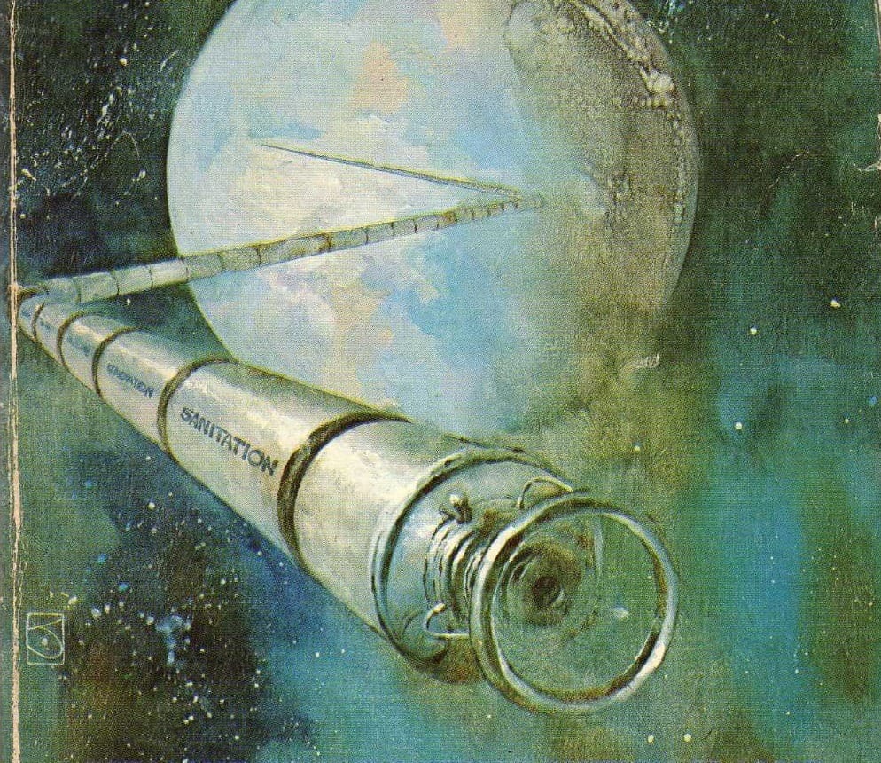 This sanitation tube by Jeffrey Catherine Jones graced the 1973 cover of Charles Platt’s Garbage World, a novel about an asteroid that serves as the dumping ground for waste materials from surrounding planets.