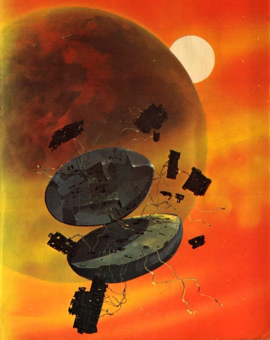 Dean Ellis also has an even earlier 1970 cover art for Deadly Litter, by James White, featuring yet another space-trash ring.