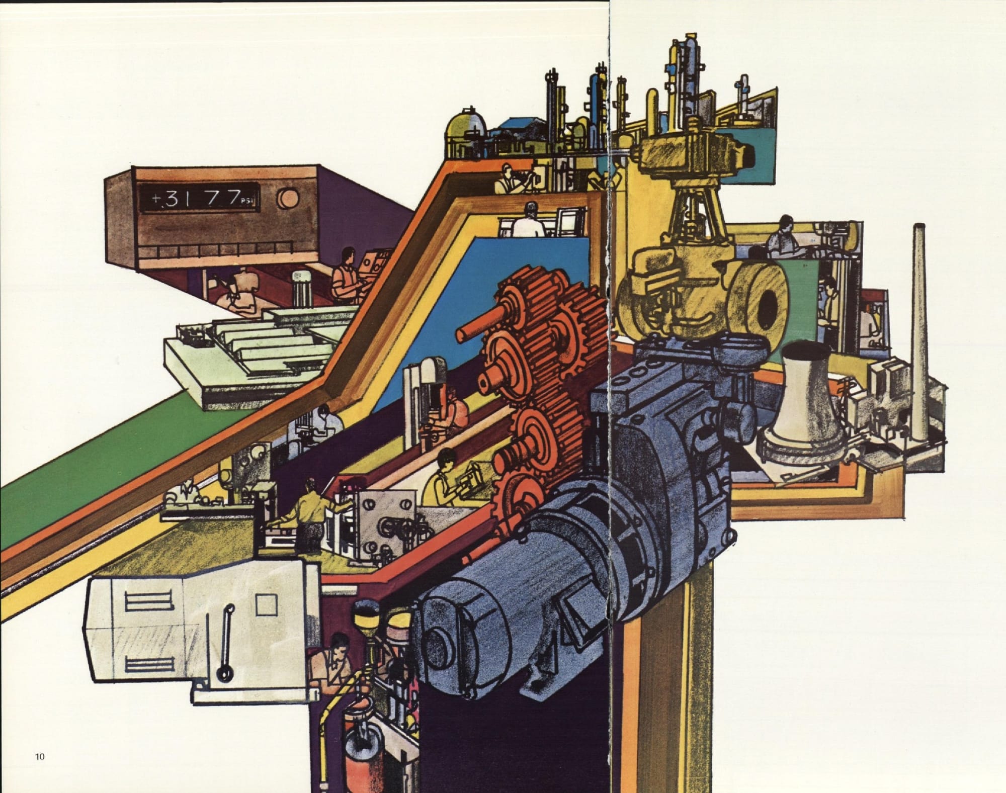 That's just a half-page illustration, though. The real stunners are saved for a series of two-page collages focused on different industries in which CONDEC is increasing shareholder value. Here they all are.