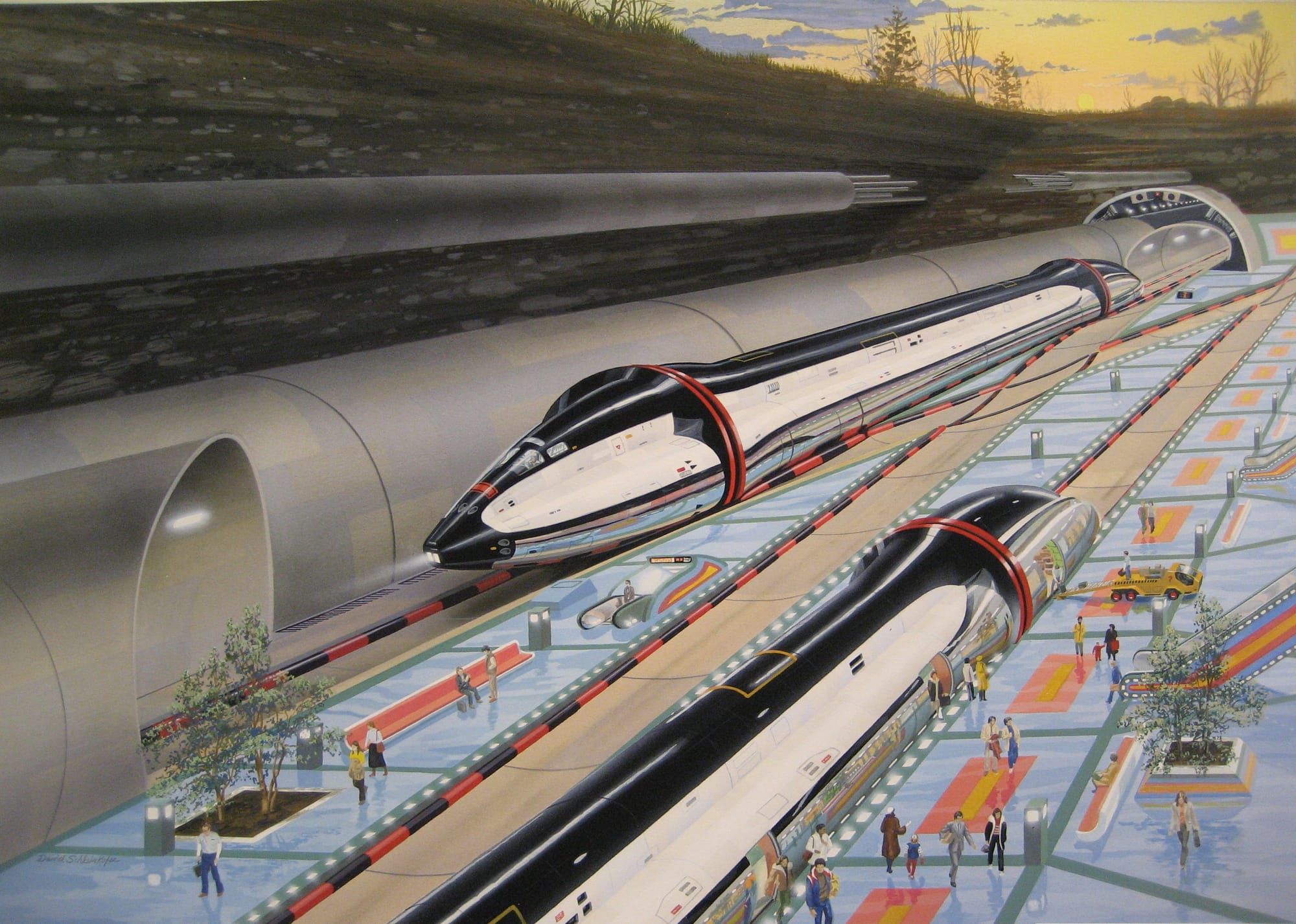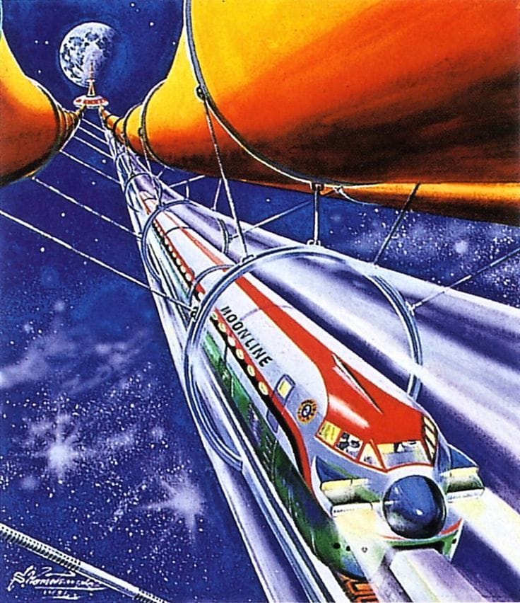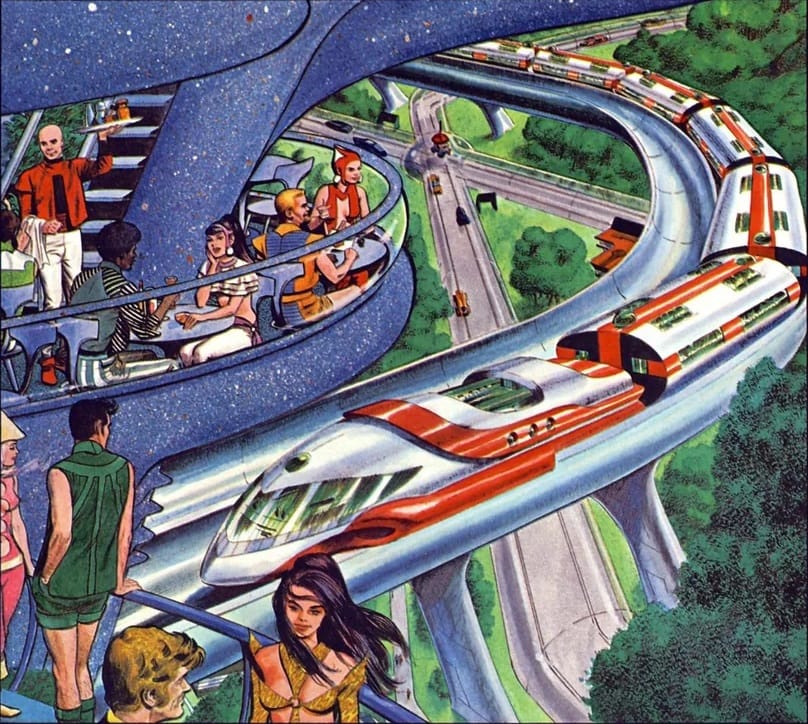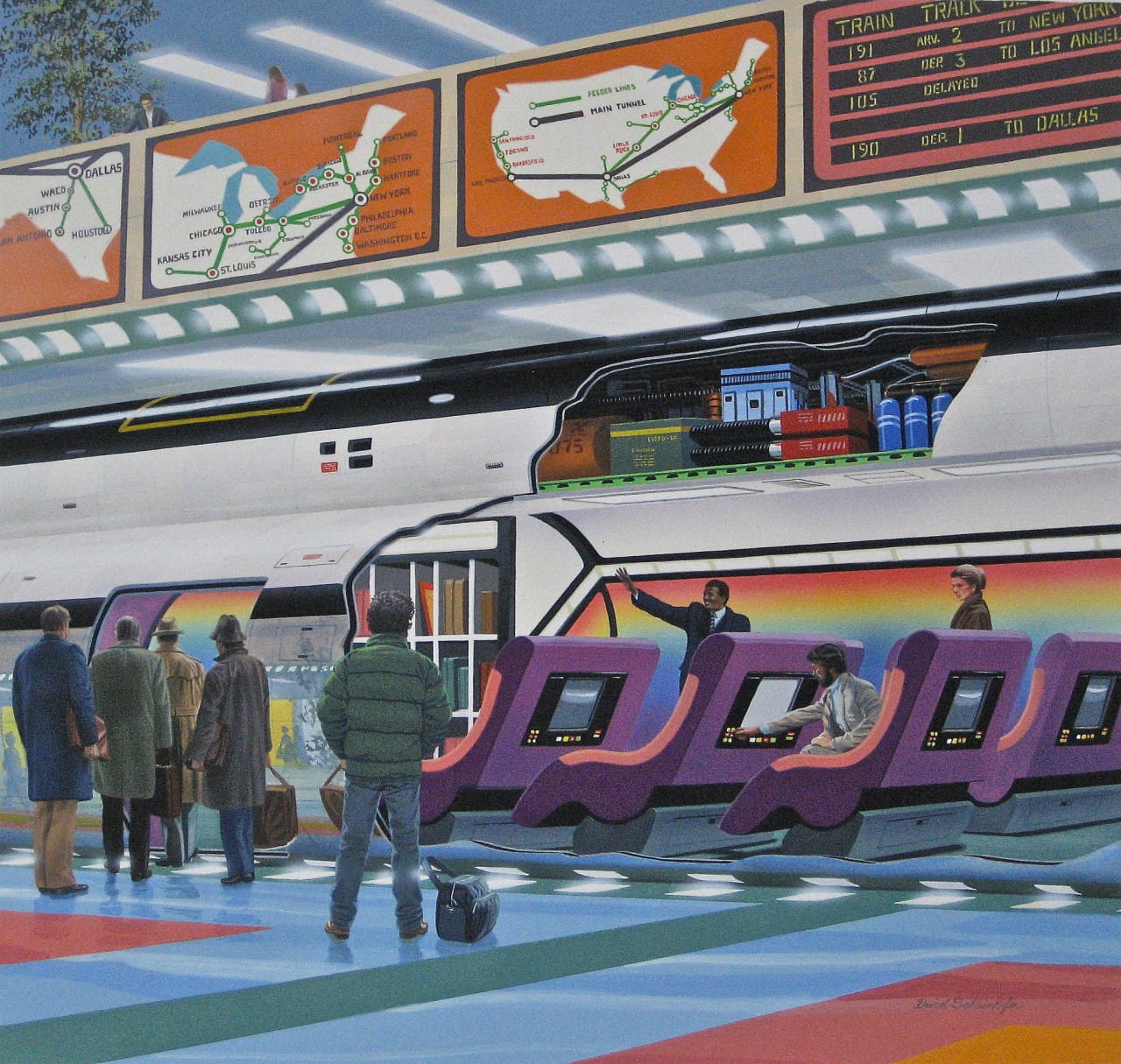 One of my favorite train illustrations is called "Supersonic Vacuum Train," by Peter Goodfellow. It's available as a postcard from the British Library, but it must have been used as an illustration before then – I just wasn't able to track it down with a quick search.