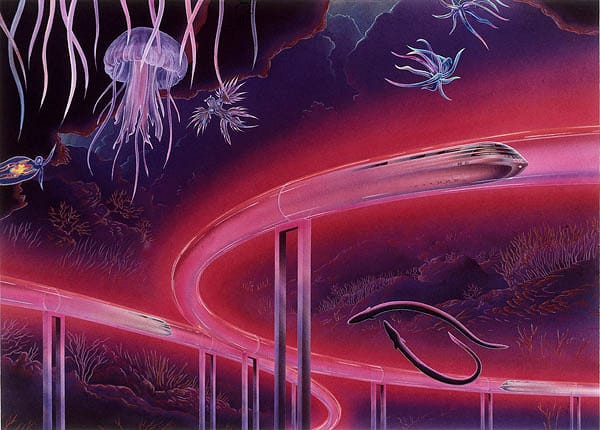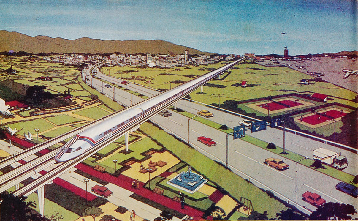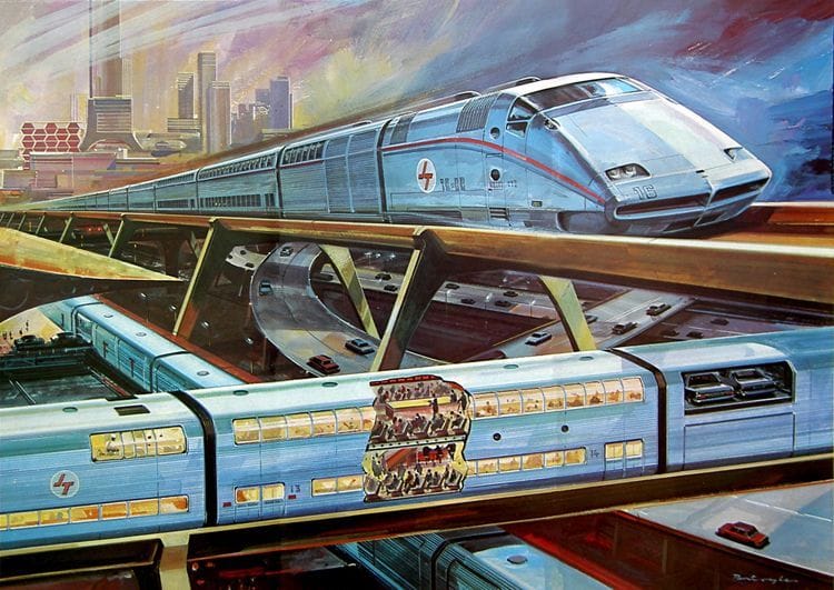 Much as magazines loved hyping up a future of amazing public transport, advertisers loved deploying cool trains in promotional materials. This one's Japanese JAL airlines promotional art for high-speed trains, from the late 1970s, according to Retro Sci-Fi Art.