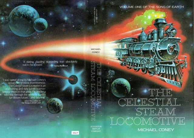 Let's end with the most on-theme title of the bunch: The Celestial Steam Locomotive, by Michael Coney. Here's Clyde Caldwell's 1983 original art and the cover itself.