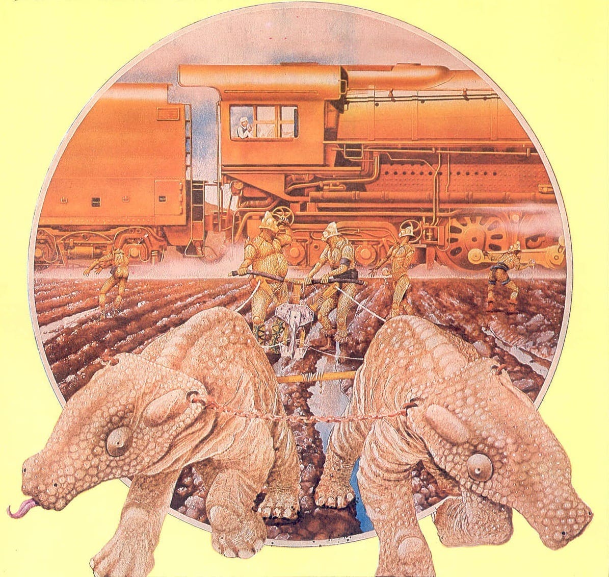 Here's another Planet Story illustration by Burns, featuring a train along with that classic beast of burden, the... uh, Komodo dragon, I think?