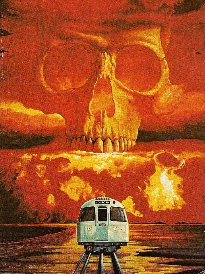 Richard Clifton-Dey makes a striking example of surrealism with the bright reds and yellows of the skull in the sky above a Holborn subway car. It's the 1973 cover for a collection of John Wyndham short stories that was titled – don't laugh – Jizzle.