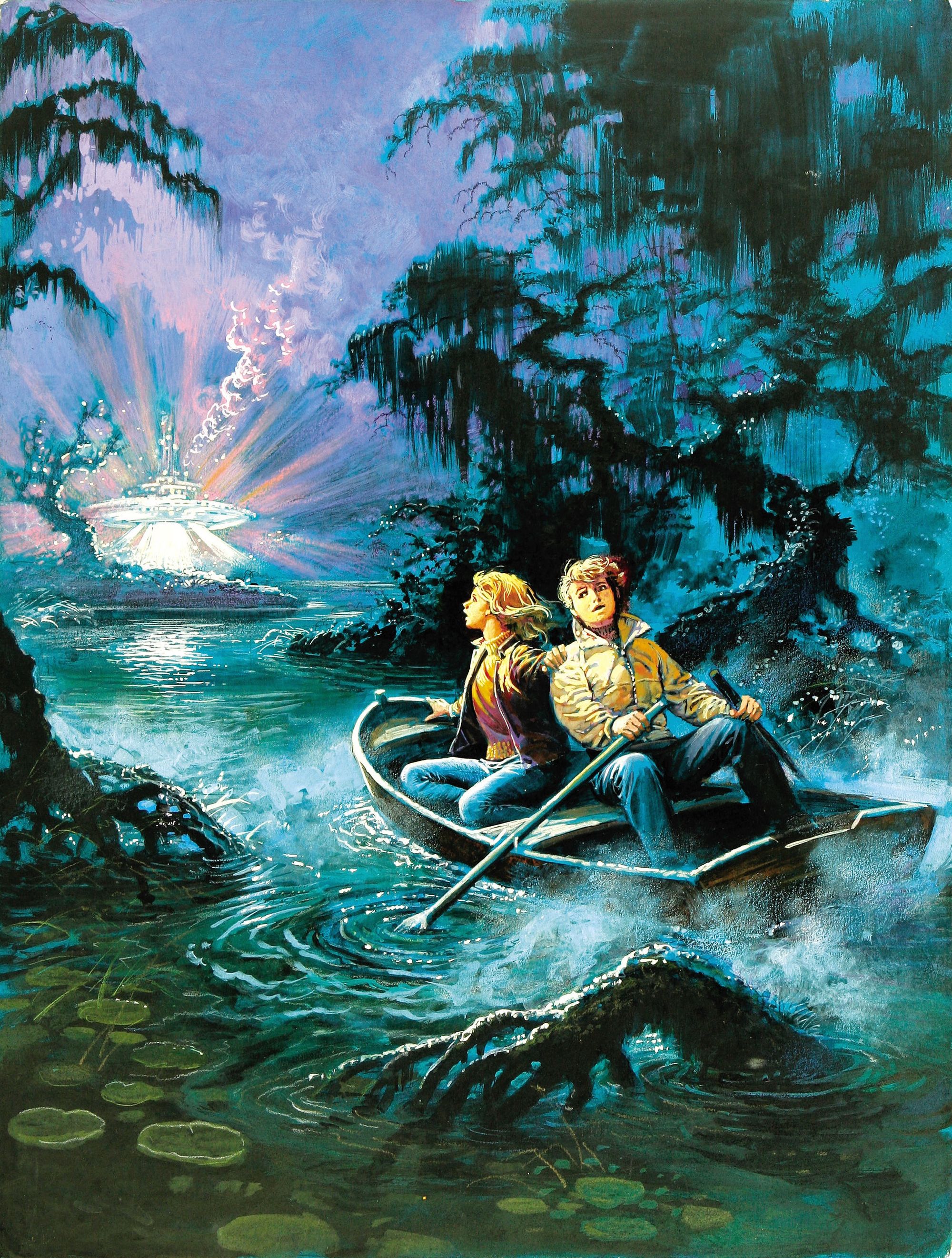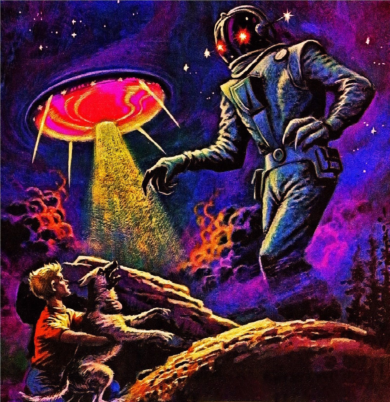 These cover paintings are always colorful and clean in a cartoon-friendly way, while depicting big high-concept alien encounters like those mentioned in the above paragraph. Aliens might be giant airborne jellyfish –