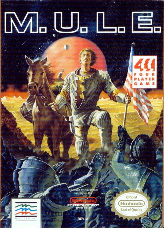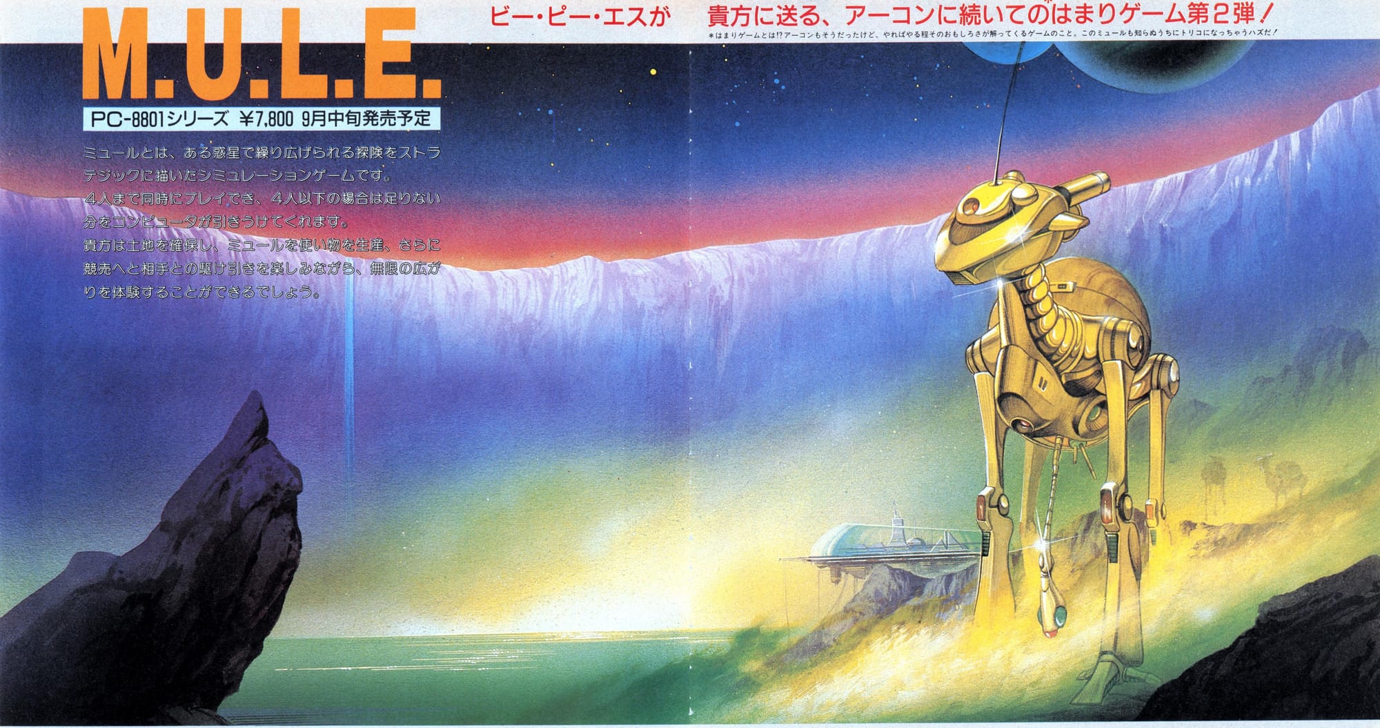 The illustration was likely done by a Japanese artist specifically for the magazine, since I don't see it on any of the game covers listed online. I also like this 1990 NES cover by Gary Ruddell, even if that particular beast looks a lot more like a mule than a M.U.L.E.