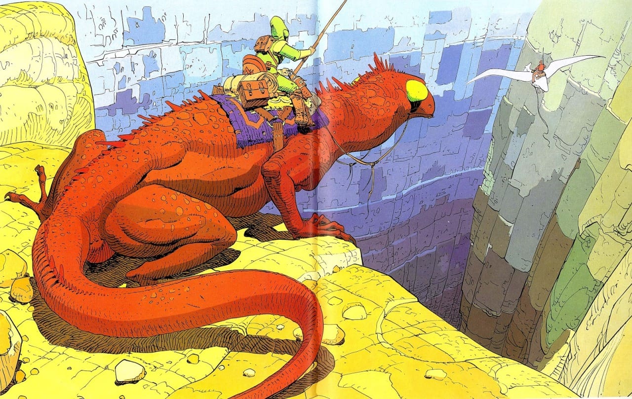 Dinosaur-like lizards are popular steeds, too. Here's a Moebius.