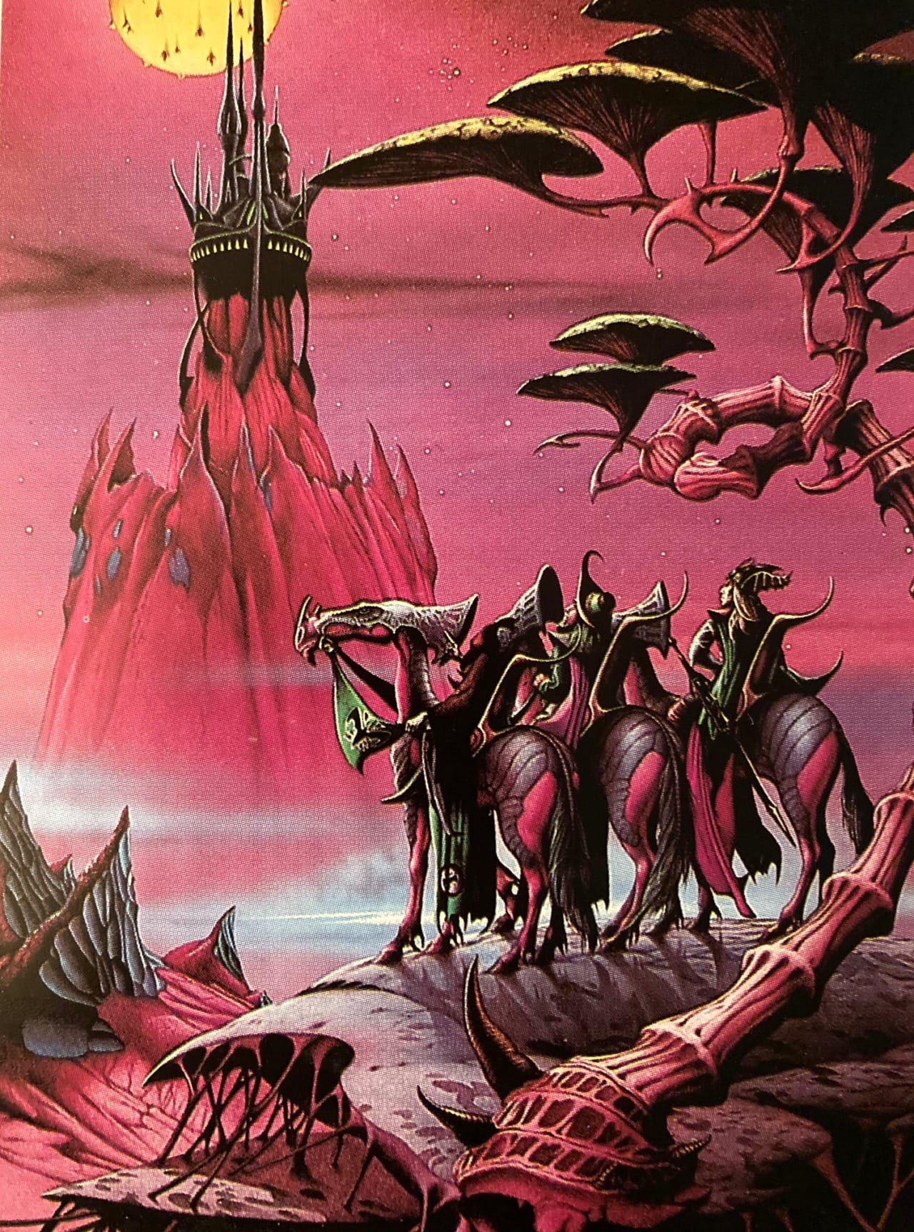 I'm not quite sure if the steeds in Rodney Matthews' 1980 artwork “Obsidian Castle” are horses or not. I think they're wearing dragon-shaped armor.