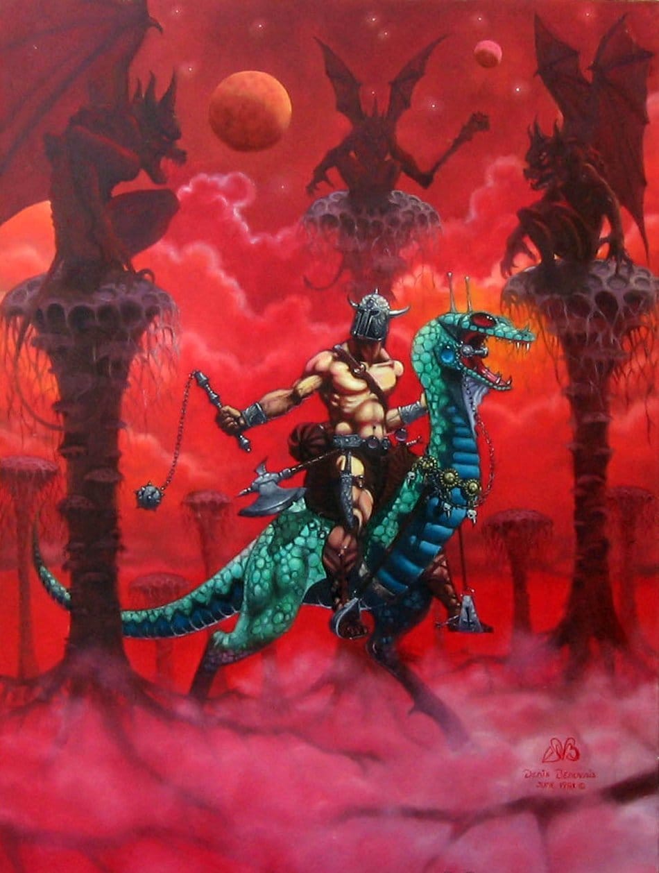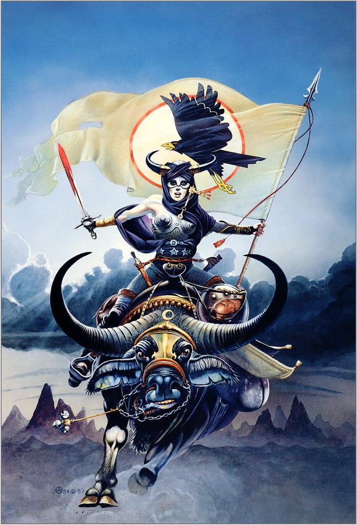 Or the warrior woman on this charging bull by Chris Achilleos, a 1989 revision of an earlier work from 1984.