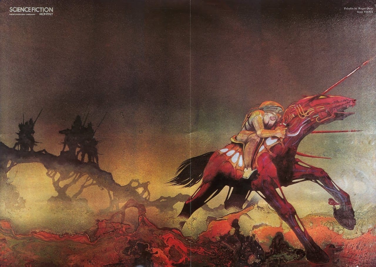 Let's wrap up on a few more horse-like rides, starting with one of my all-time favorites: The eldritch robotic horse on this Roger Dean poster from the pages of Science Fiction Monthly. I tried getting this one in my art collection, but sadly wasn't able to get in contact with Dean.